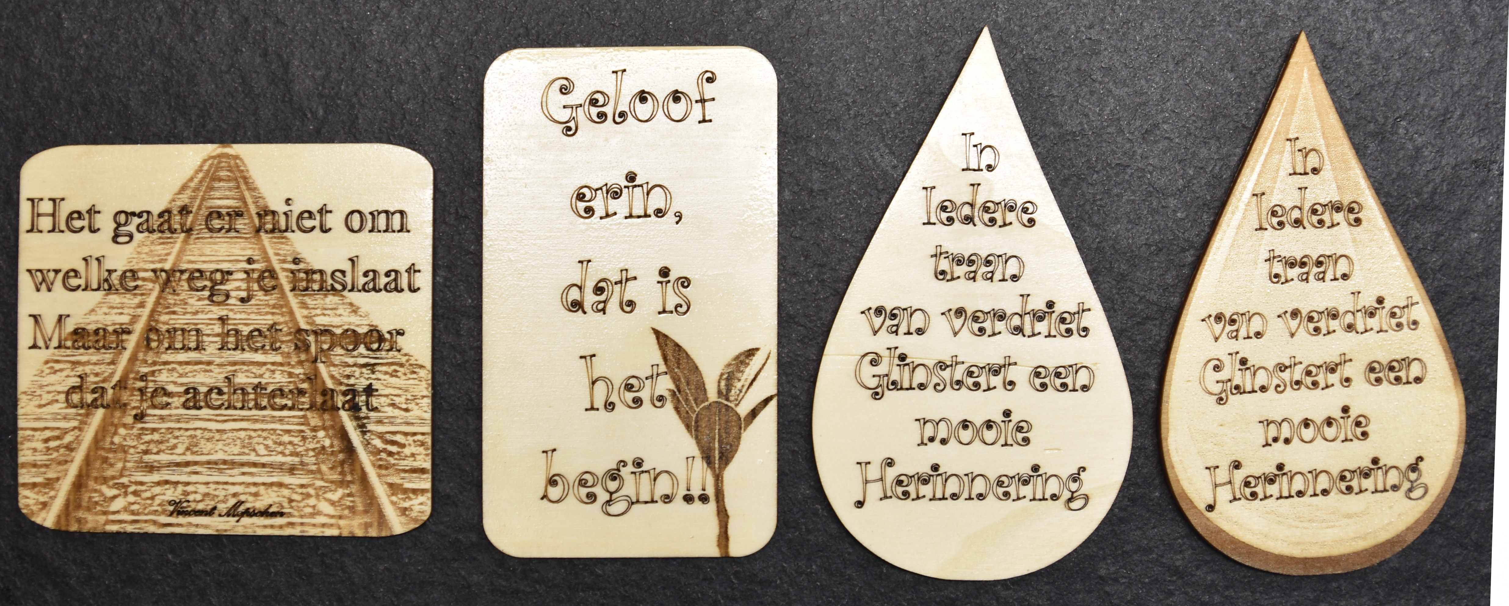 Experimenteren met verschillende spreuken op populier in diverse vormen, met of zonder achtergrond of illustratie-afbeelding. Allen gelakt zodat ze makkelijker te poetsen zijn.De spreuken plaatst u met behulp van een staander gemakkelijk waar u wilt.