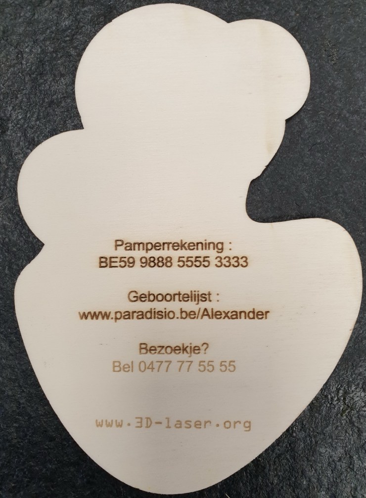 Hieronder vindt u enkele uitgewerkte voorbeelden van wat mogelijk is rond geboortekaartjes en de lasersnijder/-graveerder. Deze voorbeelden zijn direct (met aangepaste tekst) leverbaar maar ik werk ook graag een nieuw ontwerp voor u uit.