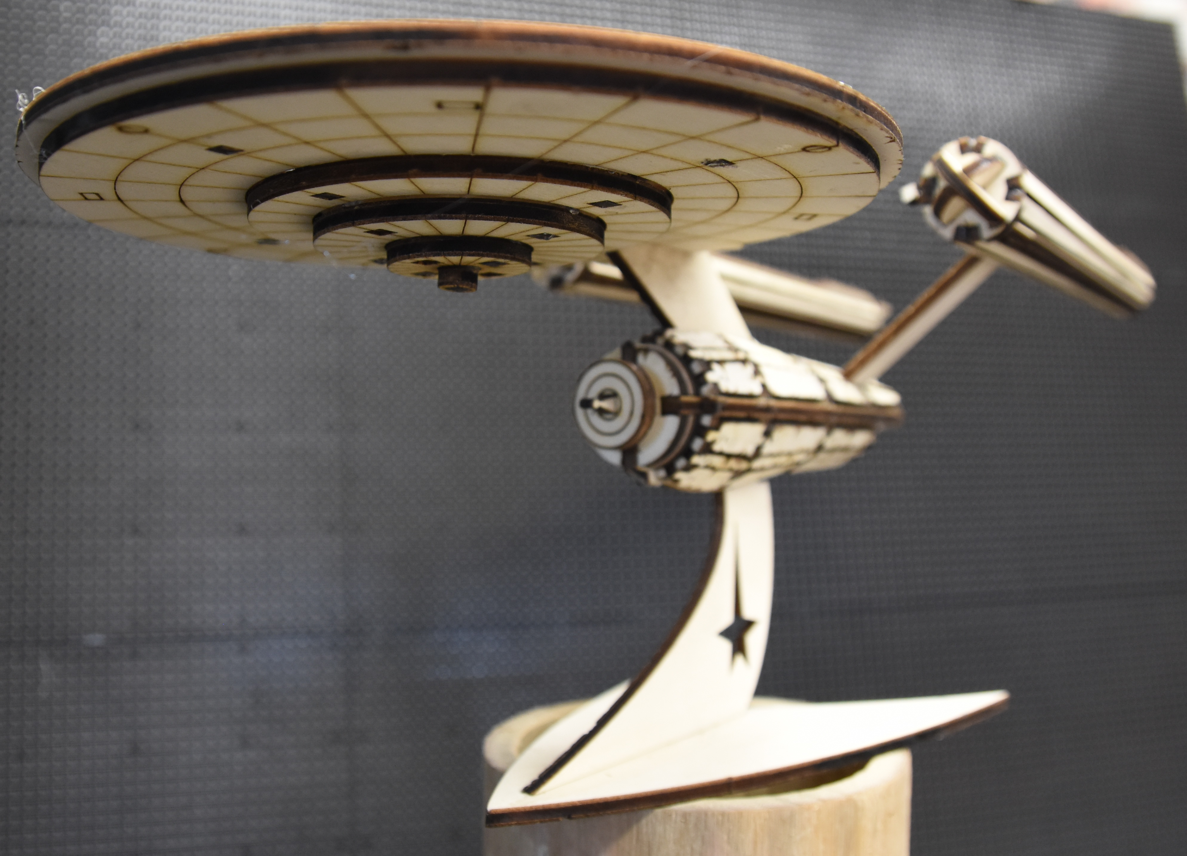 De originele USS Enterprise uit 4mm multiplex. 110 stukken en prachtige details. Komt met gedetailleerde montagehandeleiding. Formaat 40x17x10cm (LxBxH) zonder staander. Middelmatige moeilijkheid. Klemmen en vooral sneldrogende houtlijm maken de klus veel makkelijker. Design by : https://www.thingiverse.com/JoeSnuffie/about